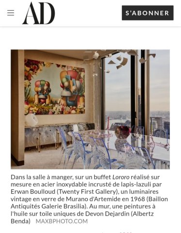 In the dining room, on a Lororo sideboard custom-made in stainless steel and inlaid with lapis lazuli by Erwan Boulloud (Twenty First Gallery), stands a vintage Murano glass light fixture by Artemide, dating from 1968 (Baillon Antiquités Galerie Brasilia). On the wall hangs a unique oil-on-canvas painting by Devon Dejardin (Albertz Benda).