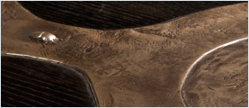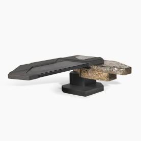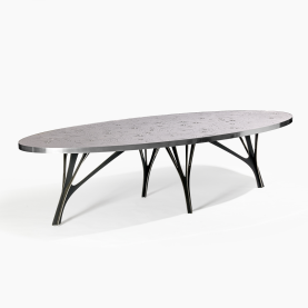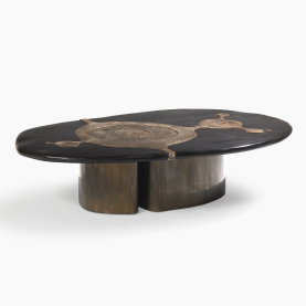 Dining table in burnt wood with multiple detailed inlays and patinated brass base.
