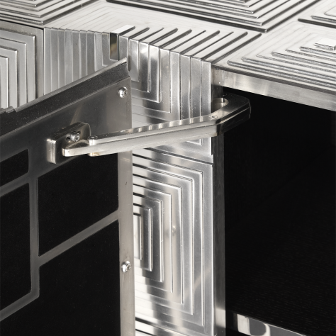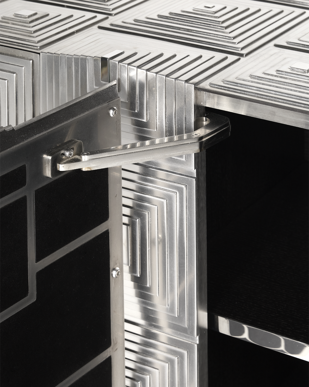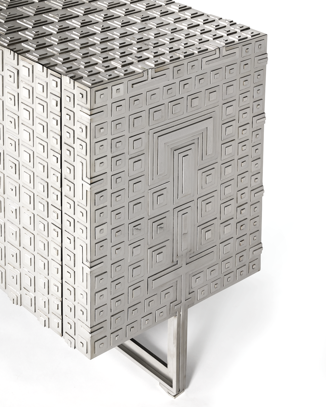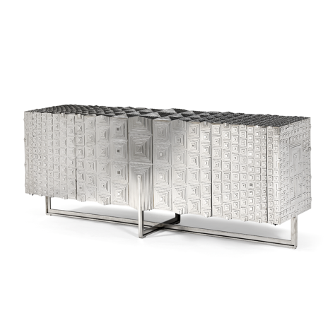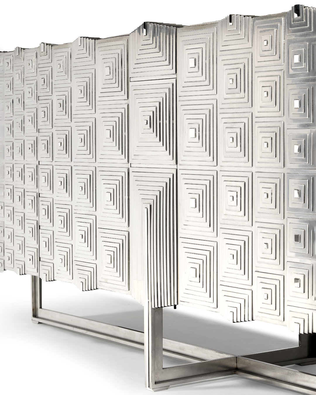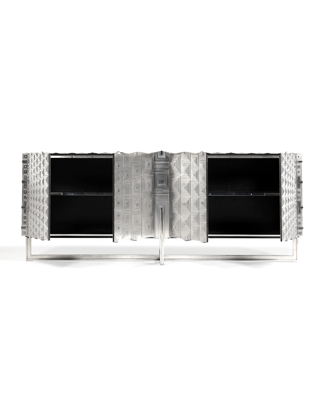PDF Précédent Pause Suivant Romanesco Mobilier / Furniture 2025 Enfilade, marqueterie d'inox poli.Sideboard, polished stainless steel marquetry. 207x46 cm - H 83