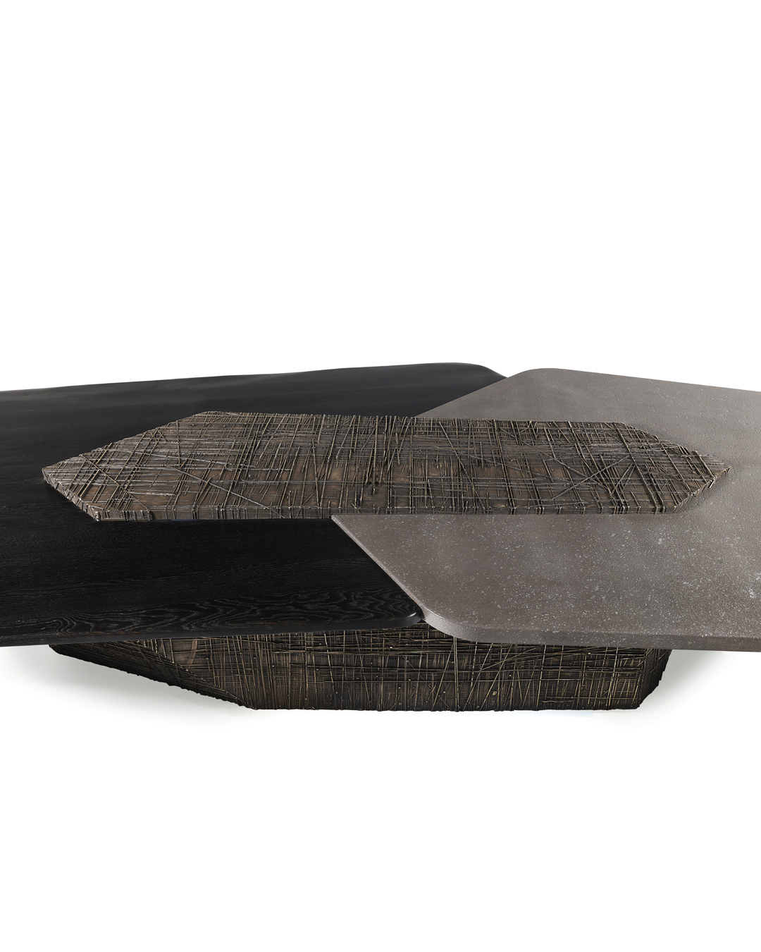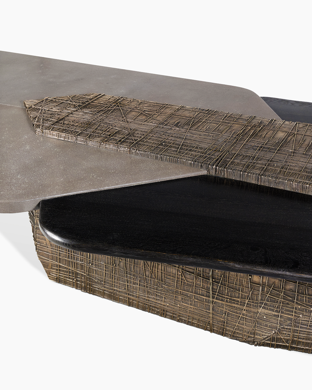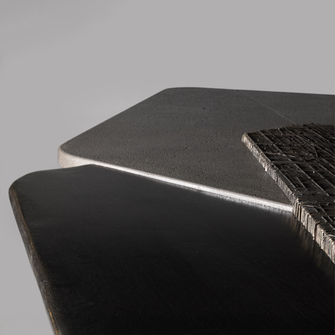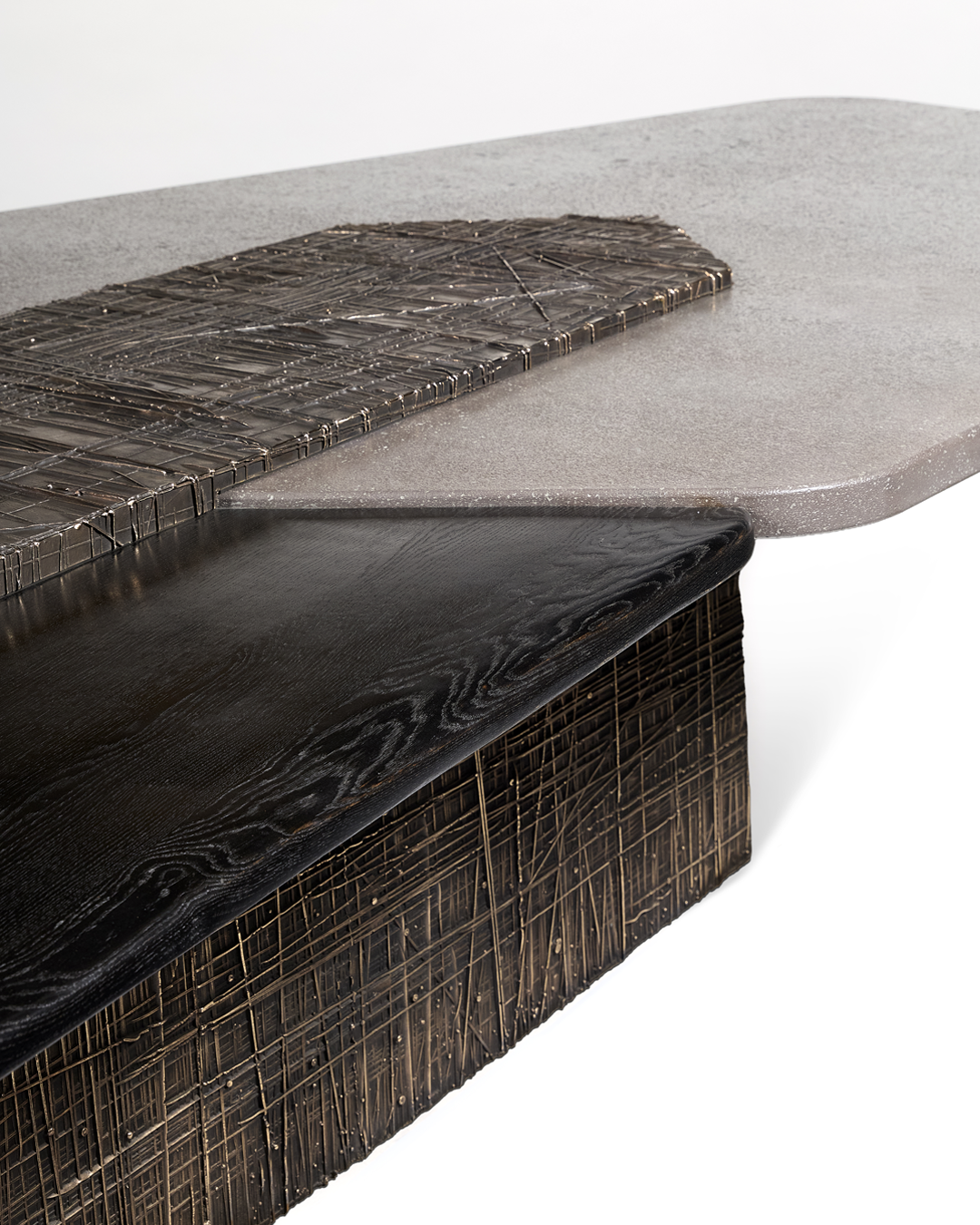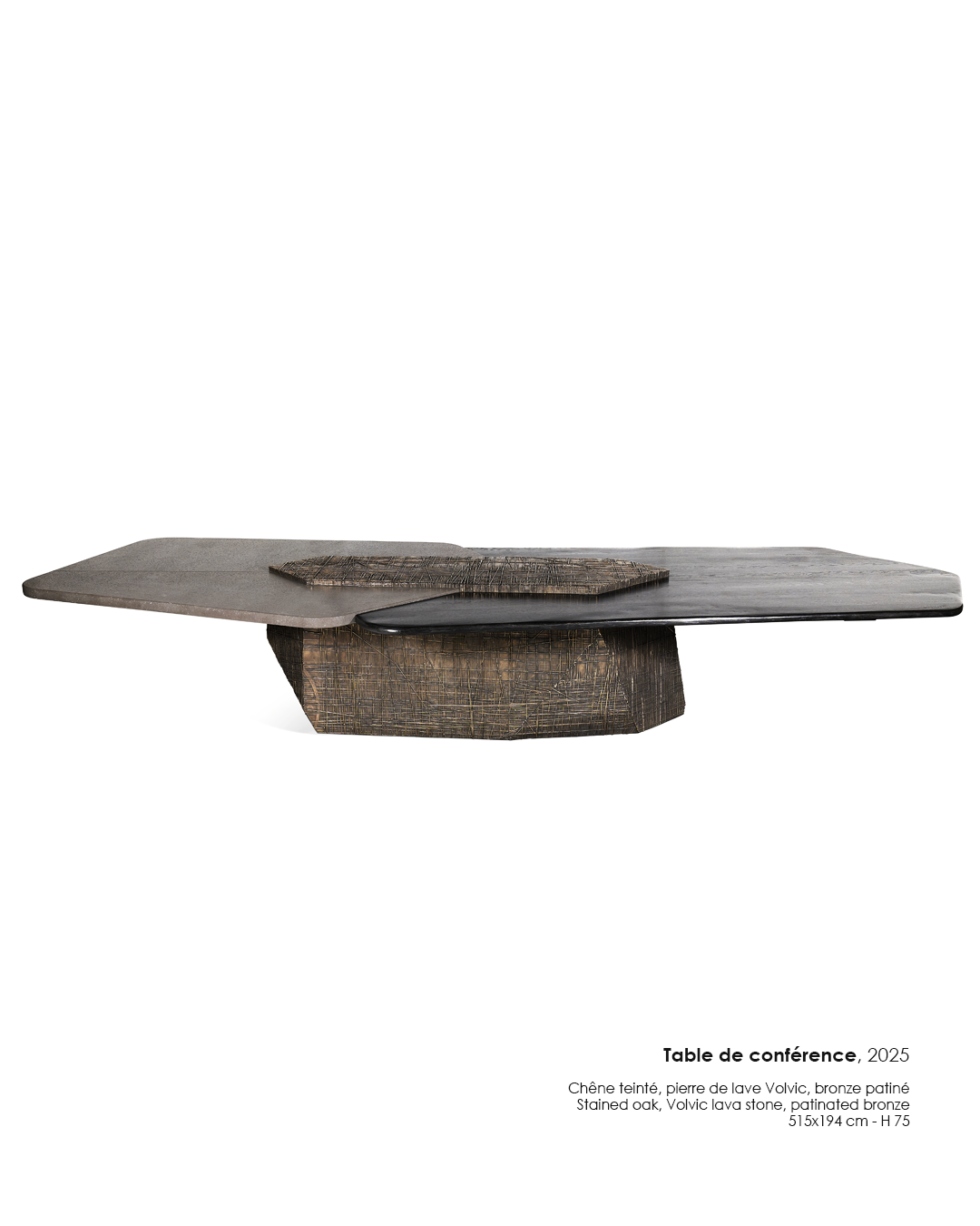 PDF Précédent Pause Suivant Table de conférence Mobilier / Furniture 2025 Chêne teinté, pierre de lave Volvic, bronze patiné Stained oak, Volvic lava stone, patinated bronze515x194 cm - H 75