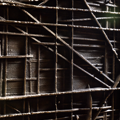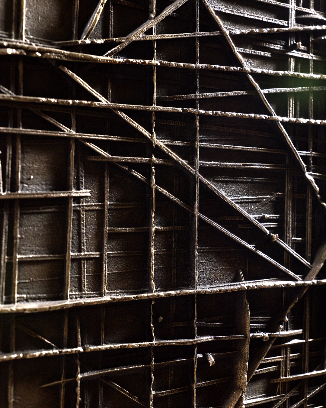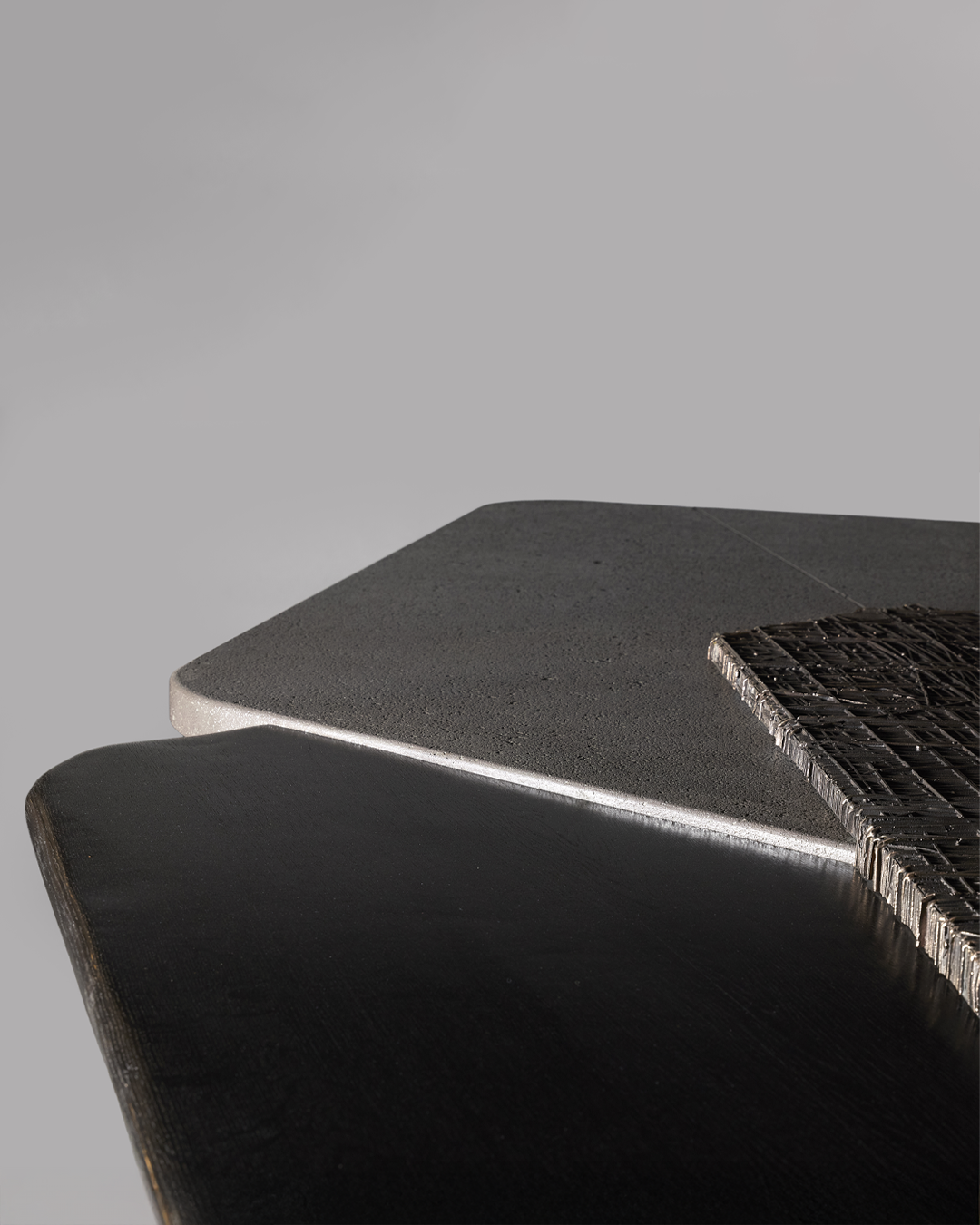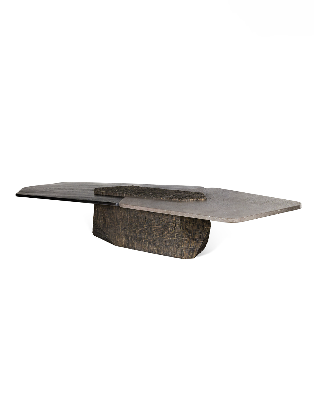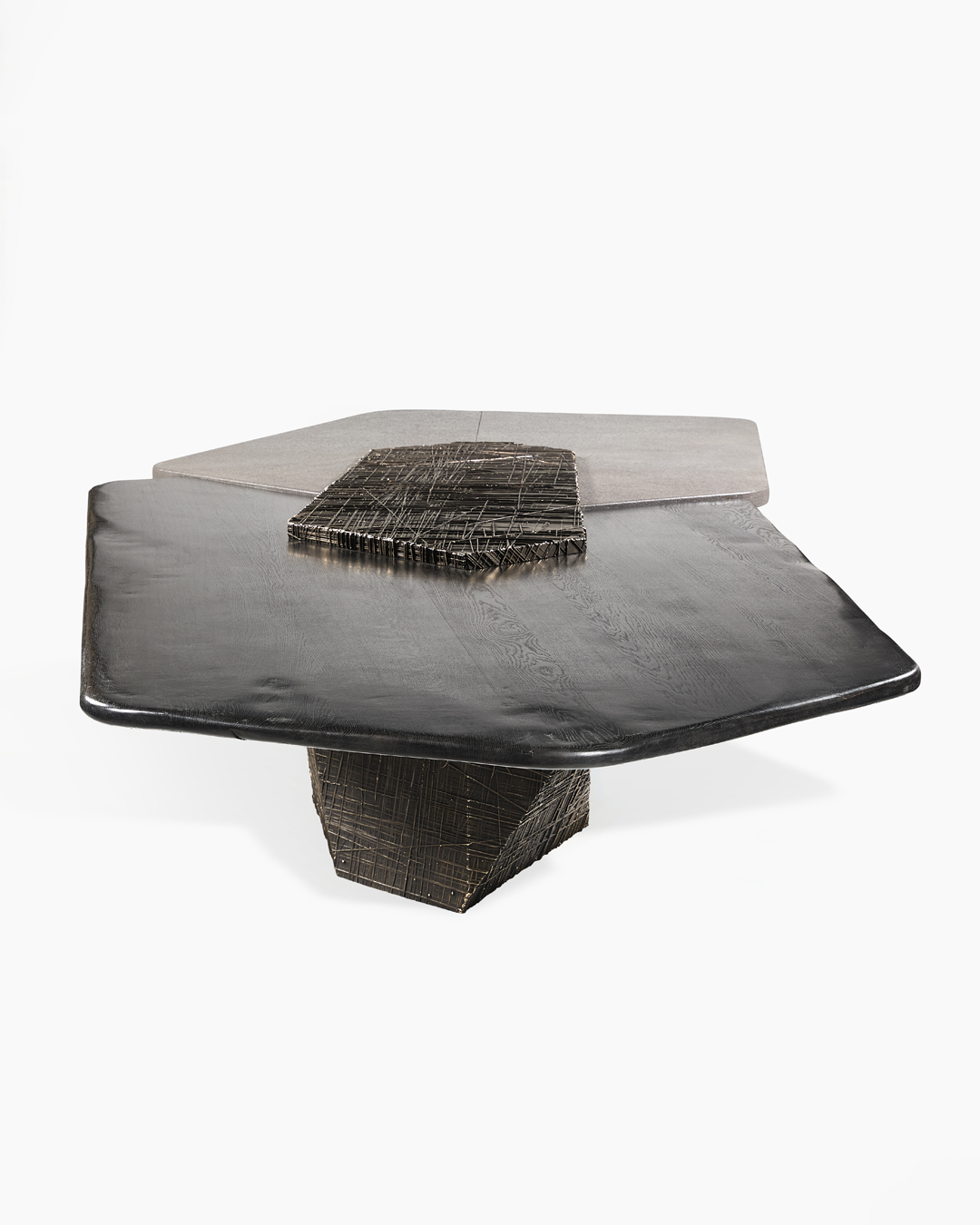PDF Précédent Pause Suivant Table de conférence Mobilier / Furniture 2025 Chêne teinté, pierre de lave Volvic, bronze patiné Stained oak, Volvic lava stone, patinated bronze515x194 cm - H 75